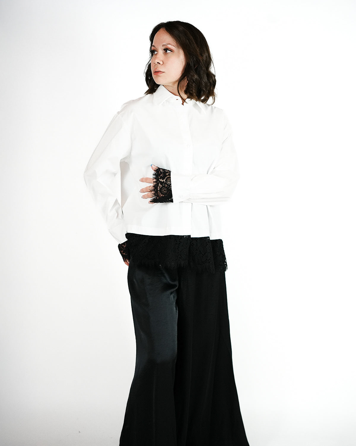 A clean white shirt with a relaxed silhouette and subtle lace cuff detail. Classic in form, refined in finish — designed for effortless styling with both tailored and casual pieces.